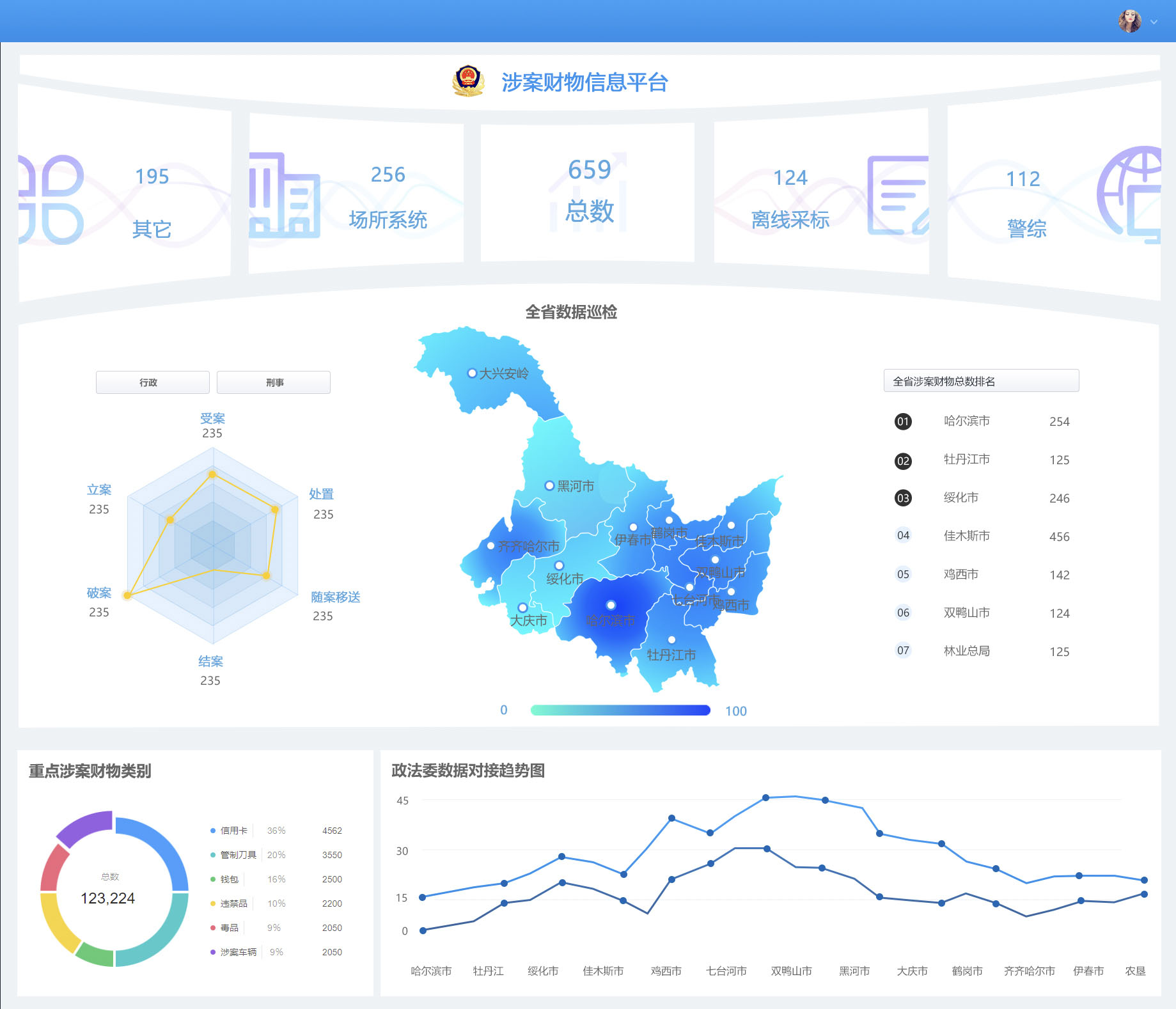 黑龍江省涉案財物管理系統(tǒng),是在中央政法委、黑龍江省委政法委、省公安廳按照《涉案財物跨部門集中管理信息平臺工作方案》建設(shè)的背景下研發(fā)應(yīng)用。實現(xiàn)全省各地市局涉案財物數(shù)據(jù)的匯聚和業(yè)務(wù)監(jiān)管,完成涉案財物跨公檢法數(shù)據(jù)互聯(lián)互通,全流程閉環(huán)管理。
