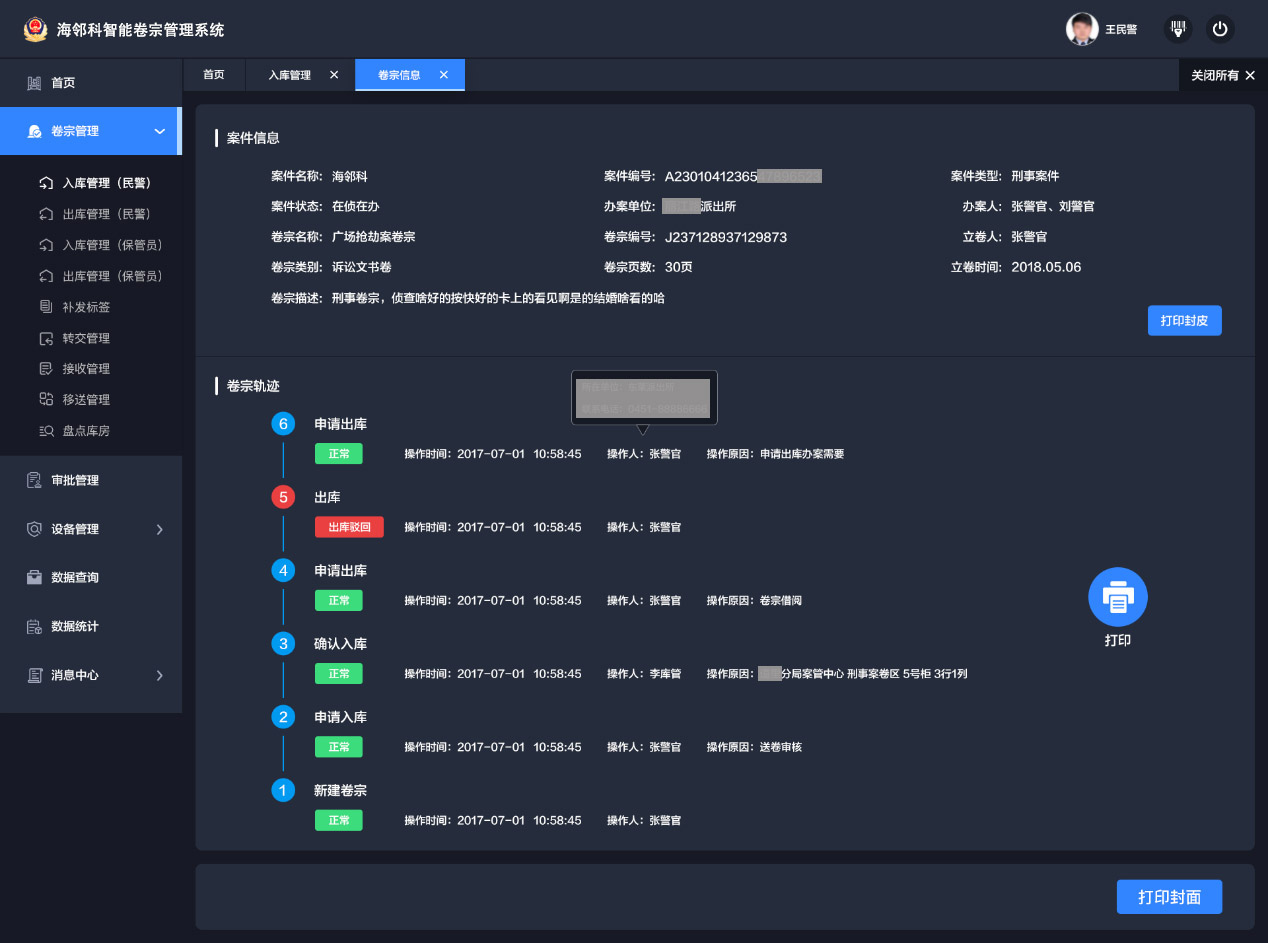 堅(jiān)持讓專業(yè)的人做專業(yè)的事,配備專職管理人員,將偵查人員從事務(wù)性工作中解脫出來,專注于訊問辦案。通過信息化管理手段,實(shí)現(xiàn)卷宗的安全保管、軌跡追溯,切實(shí)保障立卷及時(shí)、保管安全、出入留痕。