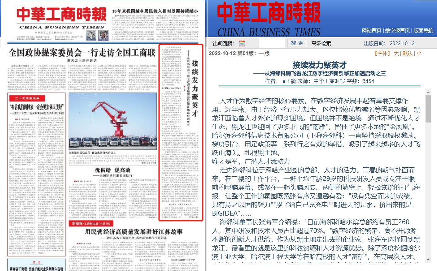 2022年10月12日,《中華工商時報》頭版連載《接續(xù)發(fā)力聚英才——從海鄰科騰飛看龍江數(shù)字經(jīng)濟新引擎正加速啟動之三》,講述海鄰科作為北飛的"南雁",一直堅持采取股權(quán)激勵、梯度引育、用足政策等一系列行之有效的舉措,吸引了越來越多的人才飛躍山海關(guān)、扎根黑土地。海鄰科已成為引領(lǐng)龍江數(shù)字經(jīng)濟產(chǎn)業(yè)強勁發(fā)展的領(lǐng)頭羊。