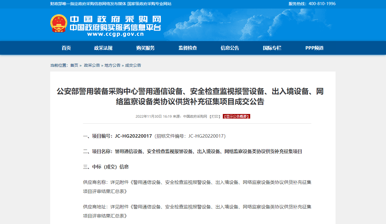 近日,中國政府采購網(wǎng)發(fā)布“公安部警用裝備采購中心警用通信設(shè)備、安全檢查監(jiān)視報(bào)警設(shè)備、出入境設(shè)備、網(wǎng)絡(luò)監(jiān)察設(shè)備類協(xié)議供貨補(bǔ)充征集項(xiàng)目成交公告”,海鄰科自主研發(fā)9個(gè)型號(hào)的智慧警務(wù)執(zhí)法產(chǎn)品成功入圍公安部警用裝備采購中心。