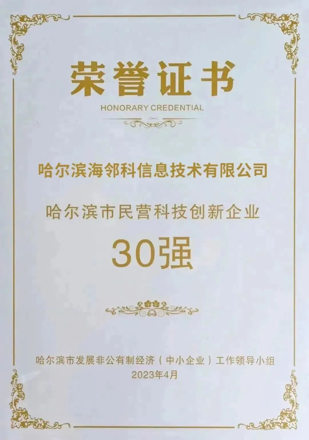 4月4日,哈爾濱市召開民營經(jīng)濟(jì)發(fā)展大會(huì),聚焦哈爾濱市民營經(jīng)濟(jì)高質(zhì)量發(fā)展,表彰優(yōu)秀民營企業(yè),安排部署民營經(jīng)濟(jì)工作,全力支持民營經(jīng)濟(jì)發(fā)展,促進(jìn)冰城現(xiàn)代化建設(shè)。哈爾濱海鄰科信息技術(shù)有限公司,依托持續(xù)的科技創(chuàng)新能力,榮獲“2023哈爾濱市民營科技創(chuàng)新企業(yè)30強(qiáng)”。