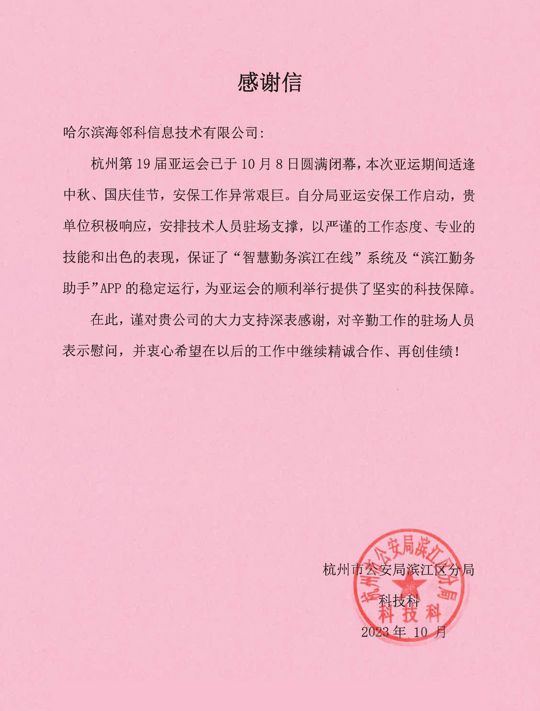 近日,海鄰科集團(tuán)收到了一封來自杭州市公安局濱江區(qū)分局的感謝信。舉世矚目的第 19 屆亞運(yùn)會(huì)于10月8日?qǐng)A滿閉幕,亞運(yùn)會(huì)期間,海鄰科項(xiàng)目團(tuán)隊(duì)以出色的專業(yè)技能和優(yōu)異的工作表現(xiàn),獲得了杭州公安的高度肯定和盛贊,展現(xiàn)出海鄰科人精益求精的服務(wù)精神和良好的企業(yè)形象。海鄰科為杭州亞運(yùn)安保交了一份滿意的答卷。
