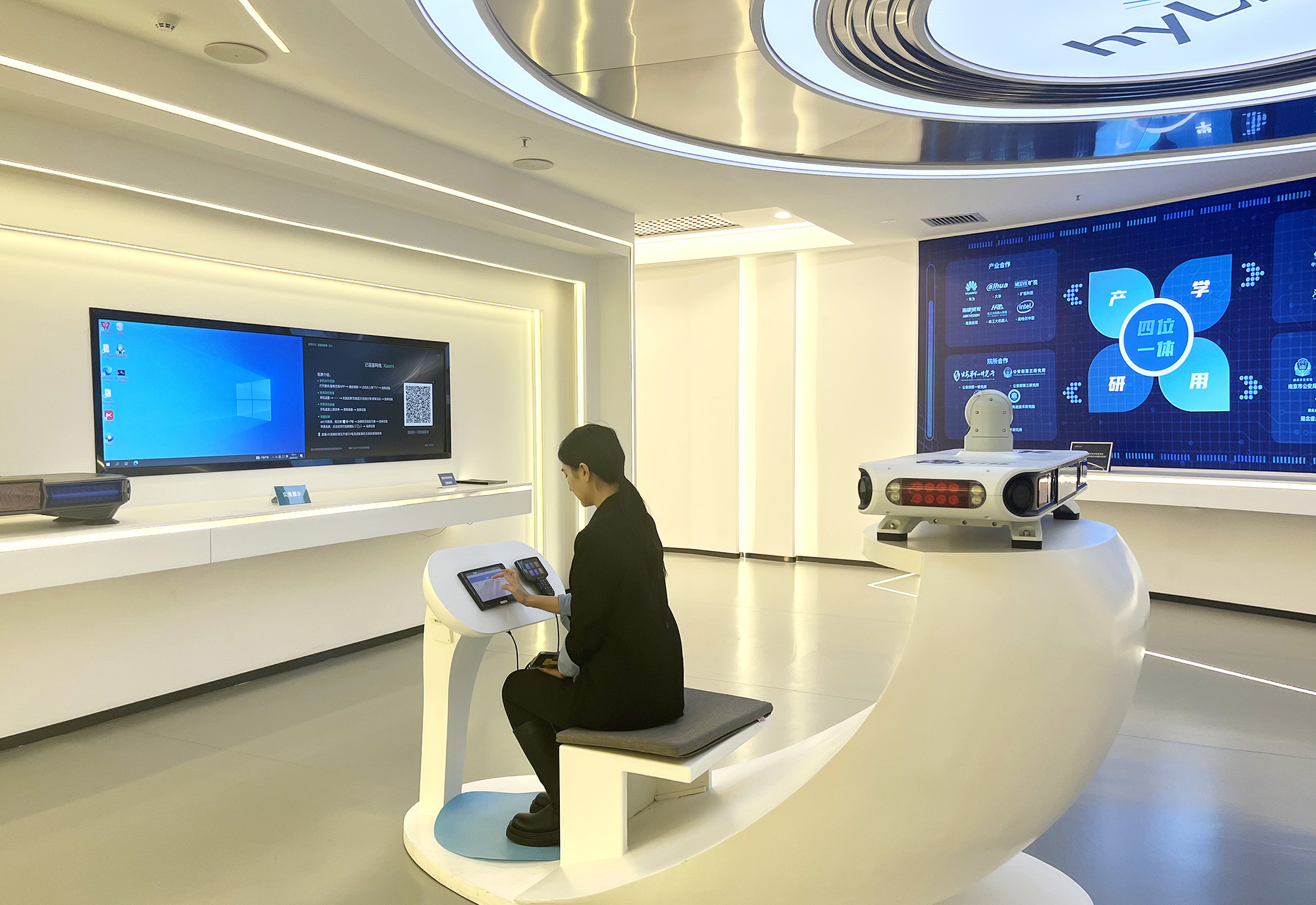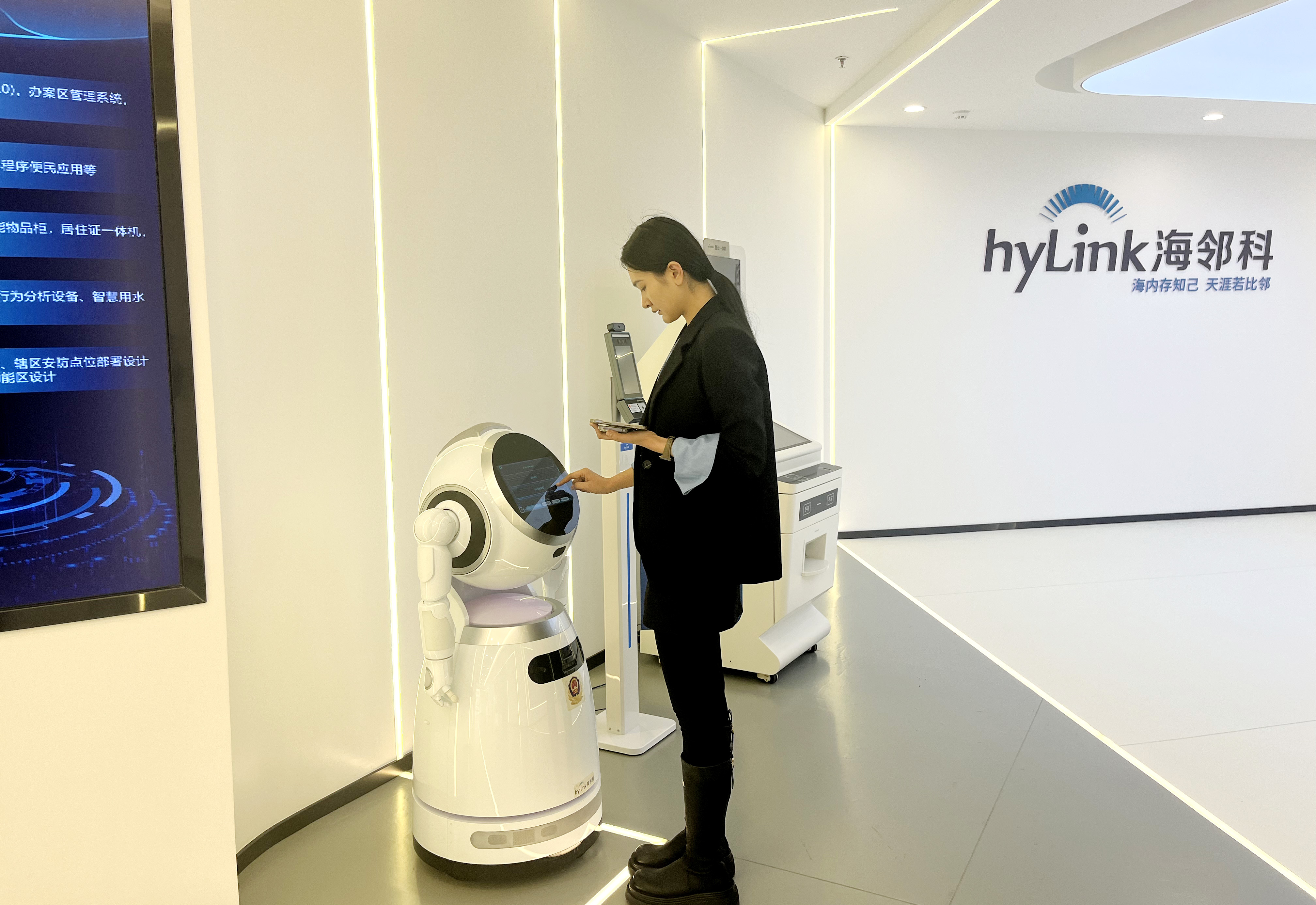 在海鄰科數(shù)字化展廳內(nèi),政務(wù)一體化機(jī)器人、智慧警務(wù)和智慧綜治系統(tǒng)、5G智慧公車系統(tǒng)及裝備、智能消防系統(tǒng)和裝備等一系列軟件系統(tǒng)平臺(tái)和智能硬件裝備,展示了海鄰科在基層社會(huì)治理數(shù)字化方面的技術(shù)創(chuàng)新和研發(fā)生產(chǎn)能力。
