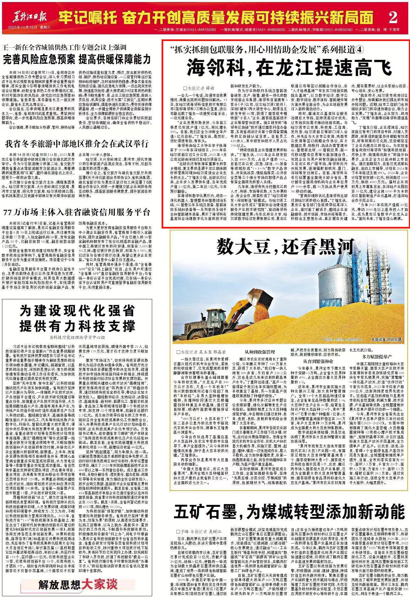 “就在昨天,哈爾濱市政府還召開專題會(huì),協(xié)調(diào)解決我們提出的市場(chǎng)開拓問題。近期,哈市工信部門也將組織多部門的溝通協(xié)調(diào)會(huì)議,助力企業(yè)發(fā)展?!倍「If,企業(yè)努力、政府助力,“雙翅”共振帶動(dòng)海鄰科提速高飛。