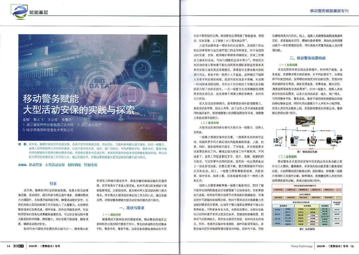 近日,中國《警察技術(shù)》雜志“移動警務(wù)賦能基層”???,以“移動警務(wù)賦能大型活動安保的實踐與探索”為題,對浙江省公安廳、杭州市公安局濱江區(qū)分局和哈爾濱海鄰科信息技術(shù)有限公司聯(lián)合研發(fā)、探索和建設(shè)的移動警務(wù)賦能大型活動安保的實戰(zhàn)應(yīng)用進行了專題分析和報道。海鄰科“移動警務(wù)”技術(shù)應(yīng)用入選《警察技術(shù)》雜志。